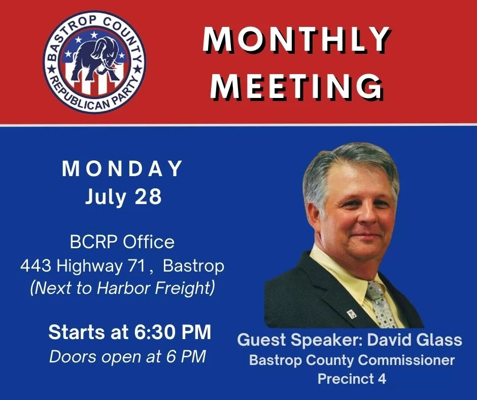 Join Bastrop County Republican Party July 28th for their monthly informational meeting. Featuring guest speaker David Glass! For more information about David Glass and BCRP, please visit July Monthly Meeting w/ Guest Speaker David Glass - Bastrop County Republican Party