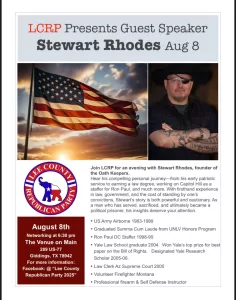 Another great and informative event in Giddings, Stewart Rhodes, founder of the Oath Keepers and Biden Administration Political Prisoner will be our guest speaker for August. The event is open to everyone. We will start with a Meet and Greet at 6:30pm and he will begin sharing his story at 7pm.