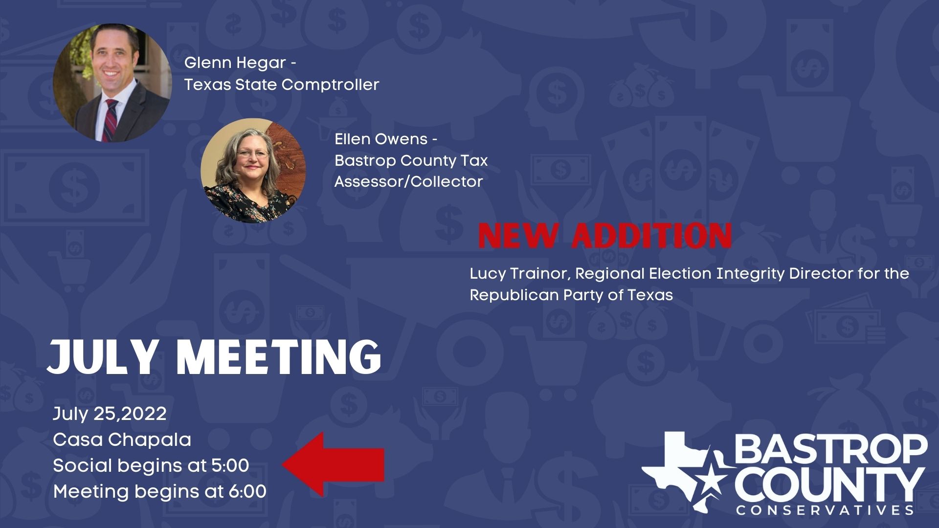 Topics will include, but not be limited to, property taxes at a State and local level – how they are calculated, who controls the rates and values, where the money is spent and what we, as voters, can do to impact our taxes. And Lucy Trainor will talk about how we can assist to ensure the integrity of our elections.